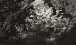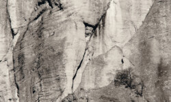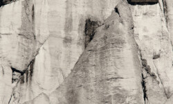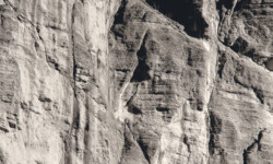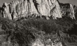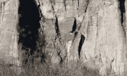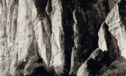 I soggetti delle fotografie raccolte in “La Pietra e le pietre” sono alcuni degli innumerevoli massi di ogni forma e dimensione che nel corso dei millenni si sono staccati dalla sommità della Pietra e sono scivolati alla base del suo perimetro; alcuni isolati, altri a gruppi o nascosti nei boschi che la circondano. Pietre di ogni forma e dimensione, coperte di muschio o di edera, spesso nascoste dalla vegetazione. Fin dall’antichità le pietre hanno racchiuso significati e simboli legati al sacro o all’esoterico: dalla pietra di Giacobbe ai menhir celtici, dalla pietra nera di forma conica, con la quale era raffigurata Cibele, alla montagna sacra simbolo del Polo o dell’Asse del Mondo, fino ad arrivare all’Uovo del Mondo ed all’Omphalos. L’asse rappresentato dalla montagna (e forse anche dai suoi frammenti) ha sempre dunque legato fra di loro il cielo e la terra. Le immagini raccolte in “Nell’abisso di un antico mare” ci ricordano le origini di questo affascinante monolite. La roccia calcarea che compone la Pietra ha avuto origine infatti in un ambiente marino risalente al Miocene. L’abisso che era colmo dell’acqua del mare è diventato oggi l’abisso d’aria intorno ai fianchi che solleva le montagne. In una sorta di immersione dal basso queste fotografie rivelano il lavoro millenario dell’acqua, del