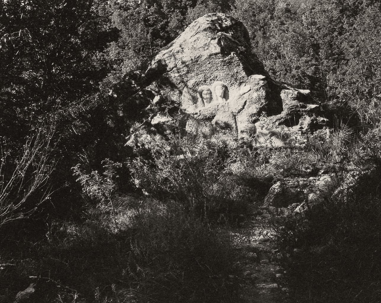I soggetti delle fotografie raccolte in “La Pietra e le pietre” sono alcuni degli innumerevoli massi di ogni forma e dimensione che nel corso dei millenni si sono staccati dalla sommità della Pietra e sono scivolati alla base del suo perimetro; alcuni isolati, altri a gruppi o nascosti nei boschi che la circondano. Pietre di ogni forma e dimensione, coperte di muschio o di edera, spesso nascoste dalla vegetazione. Fin dall’antichità le pietre hanno racchiuso significati e simboli legati al sacro o all’esoterico: dalla pietra di Giacobbe ai menhir celtici, dalla pietra nera di forma conica, con la quale era raffigurata Cibele, alla montagna sacra simbolo del Polo o dell’Asse del Mondo, fino ad arrivare all’Uovo del Mondo ed all’Omphalos. L’asse rappresentato dalla montagna (e forse anche dai suoi frammenti) ha sempre dunque legato fra di loro il cielo e la terra. Le immagini raccolte in “Nell’abisso di un antico mare” ci ricordano le origini di questo affascinante monolite. La roccia calcarea che compone la Pietra ha avuto origine infatti in un ambiente marino risalente al Miocene. L’abisso che era colmo dell’acqua del mare è diventato oggi l’abisso d’aria intorno ai fianchi che solleva le montagne. In una sorta di immersione dal basso queste fotografie rivelano il lavoro millenario dell’acqua, del